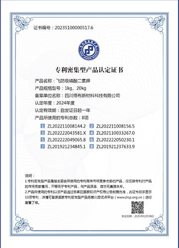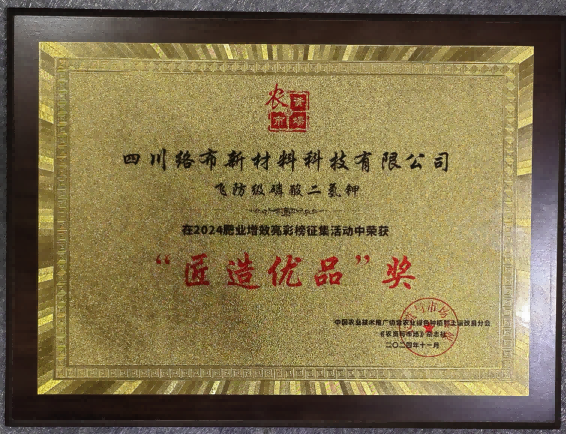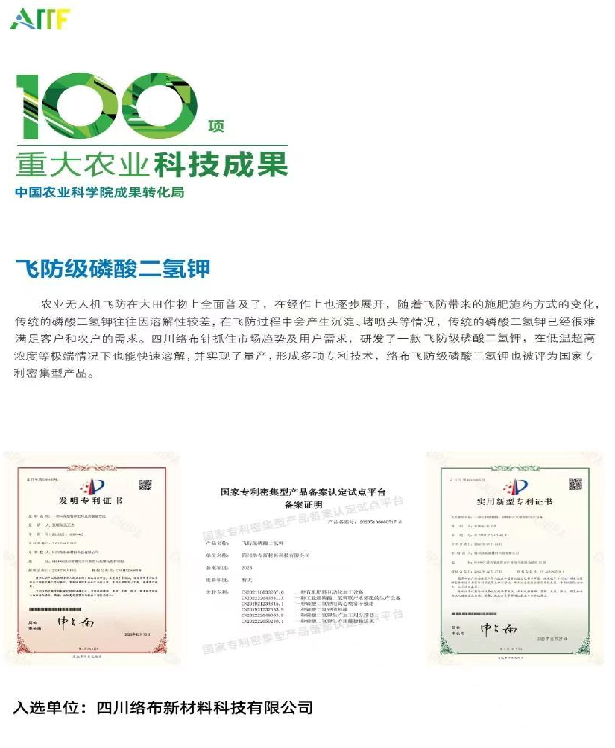四川络布新材料科技有限公司位于中国四大磷矿基地之一的四川省什邡市,注册资本2200万元。公司主要从事飞防级磷酸二氢钾的研发、生产、销售。在国内率先提出无人机植物营养专用肥的理念,已在该领域取得了4项发明专利、9项应用新型专利,被国家专利总局评为发明密集型产品。公司先后荣获“国家级高新技术企业”、四川省“专精特新”企业、“四川省首批创新型企业”、“科技型中小企业”、德阳市瞪羚企业等荣誉。“飞防磷酸二氢钾”成功入选2023中国农业科学院100项重大农业科技成果名单。